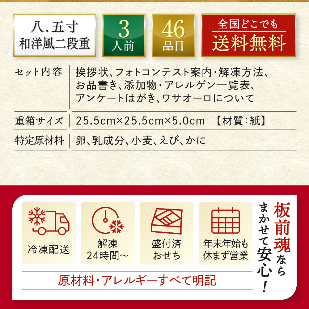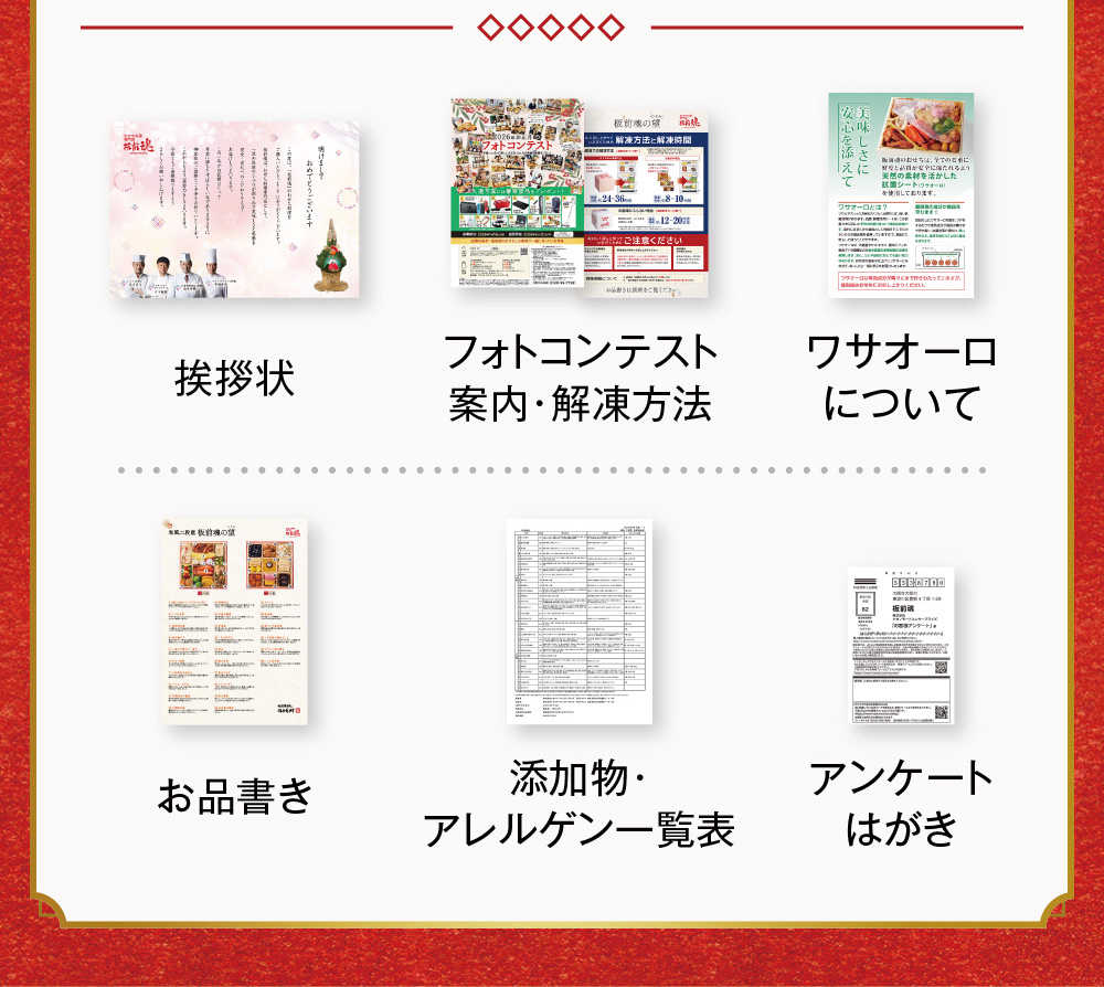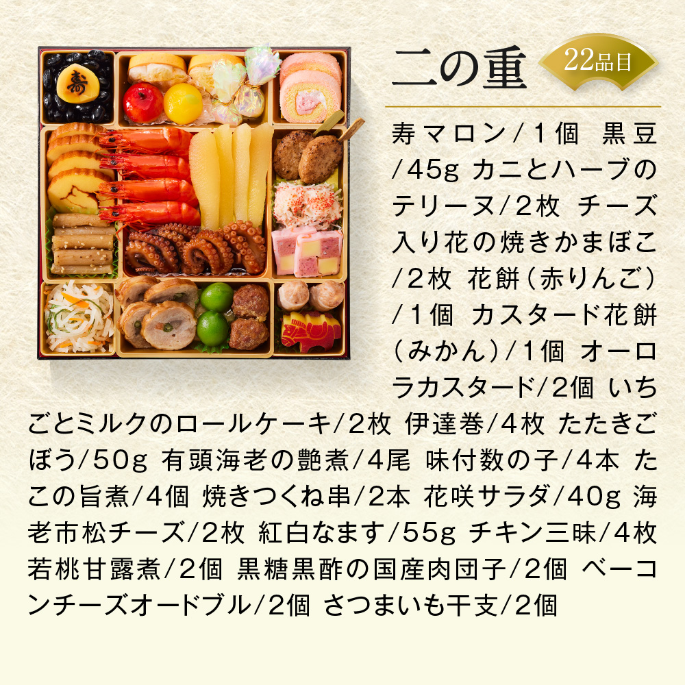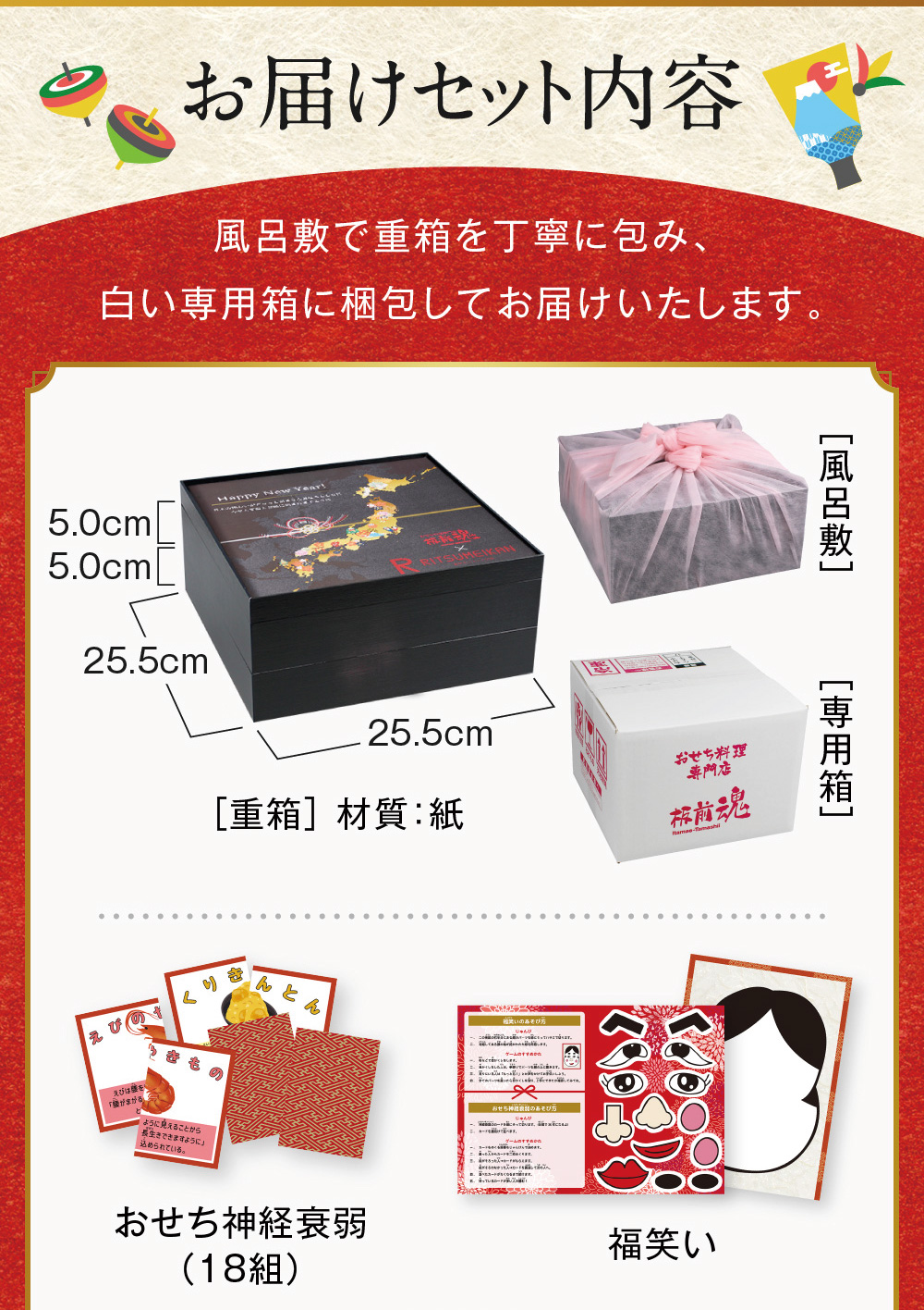 - 25.5cm×25.5cm×5.0cm×2段 / 材質:紙 / お品書き、解凍・保存方法案内付き