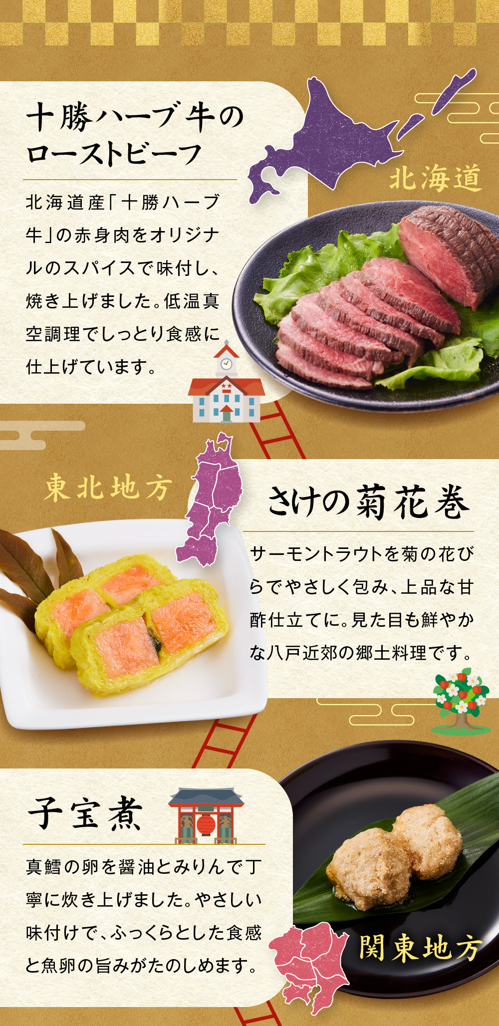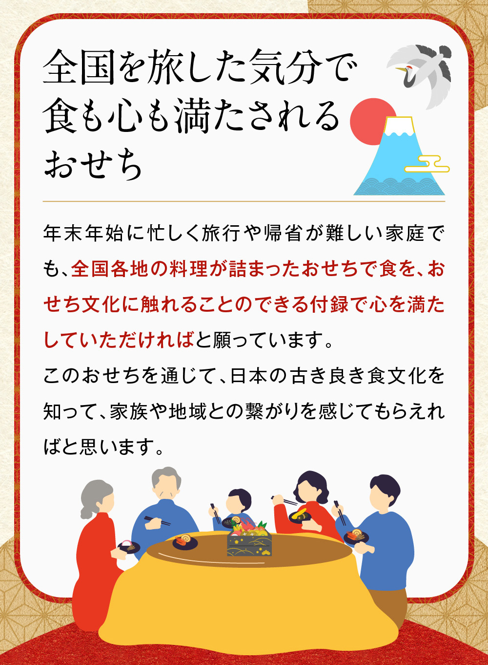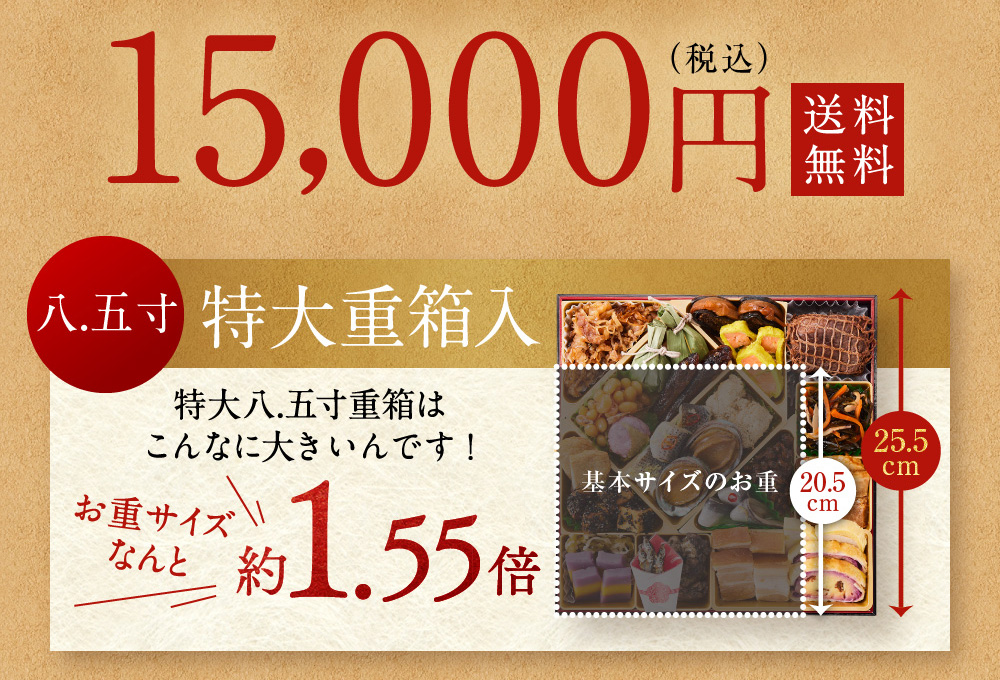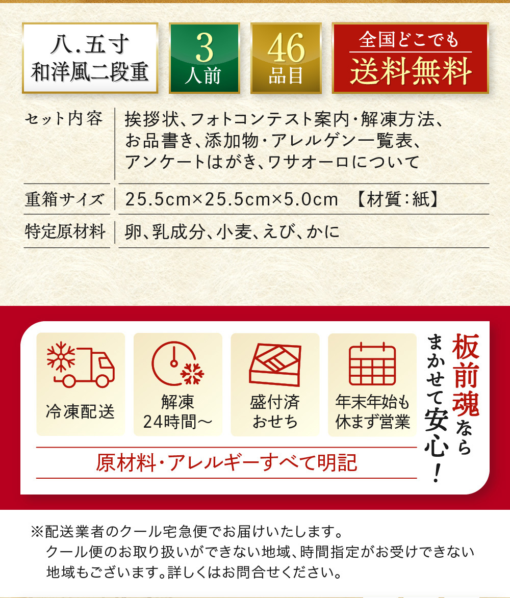 - 悪天候(積雪など)や交通事情による配達遅れを確実に防ぐため、また、おせちの解凍時間も考慮し、基本のお届け日は12月30日(火)になります。
