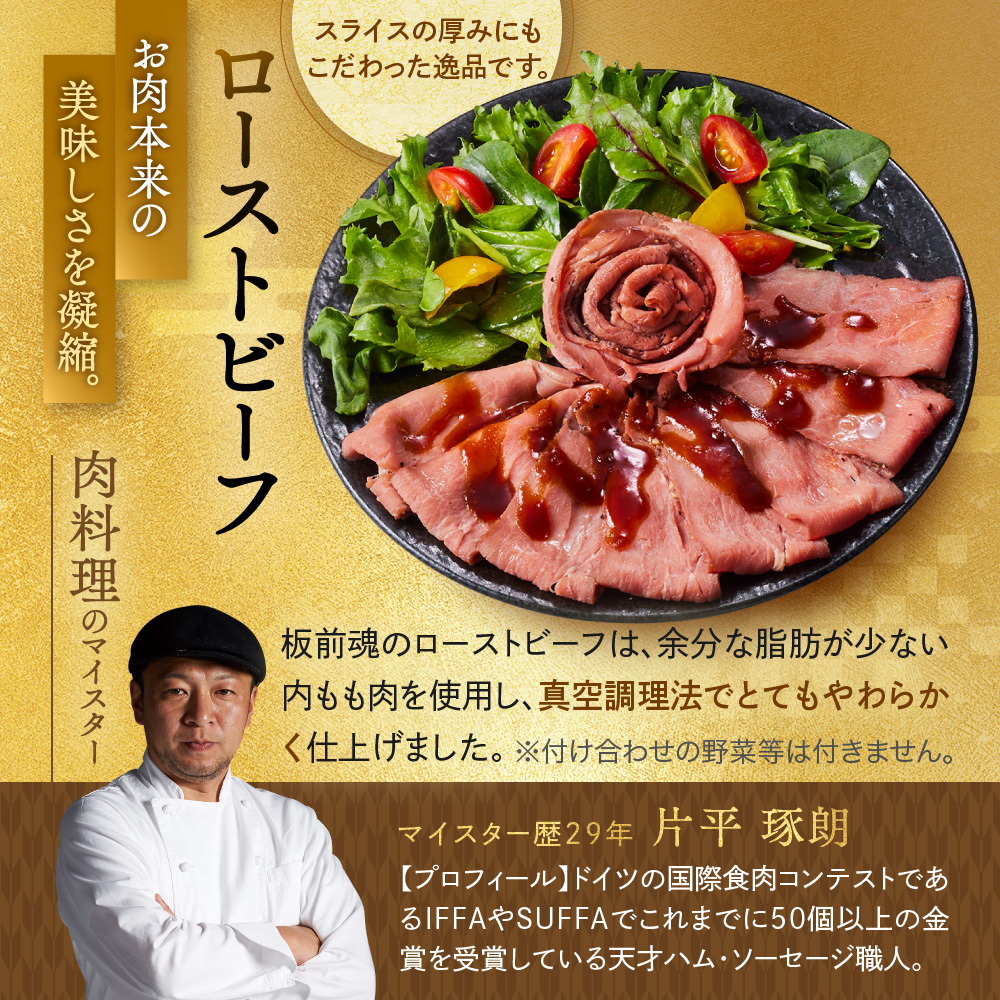 ローストビーフは厚みも大事なポイントです。贅沢さを出すために厚く切ってしまいがちですが、厚くなると繊維が沢山残るため、食感が固くなってしまいます。板前魂では柔らかく美味しく食べられる厚さを徹底追及し1.7ミリのスライスに成功しました。